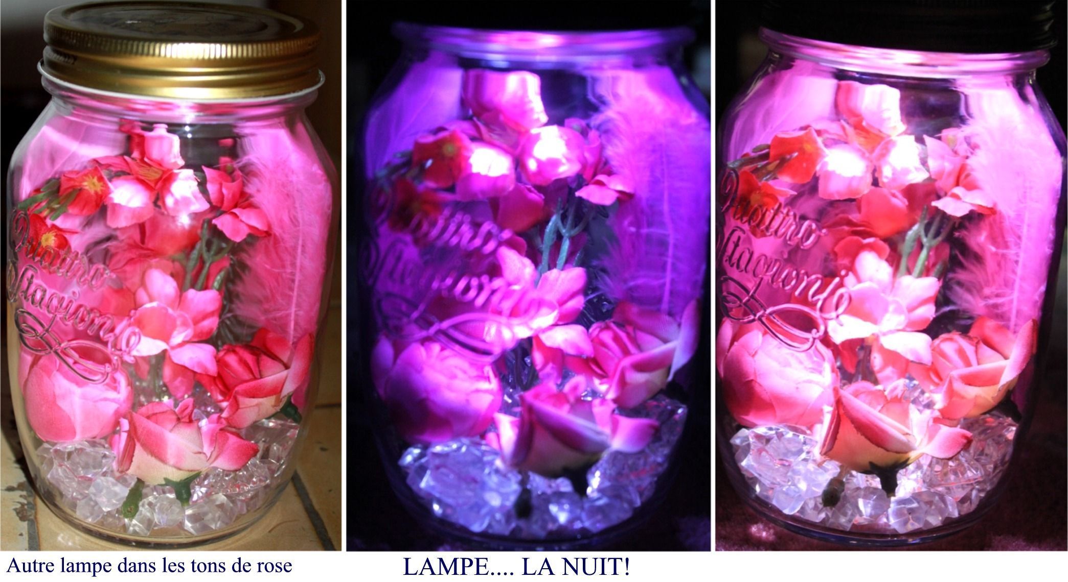 Tibo a voulu faire une lampe pour sa maman il a choisit des fleurs et des plumes dans les tons de rose ....