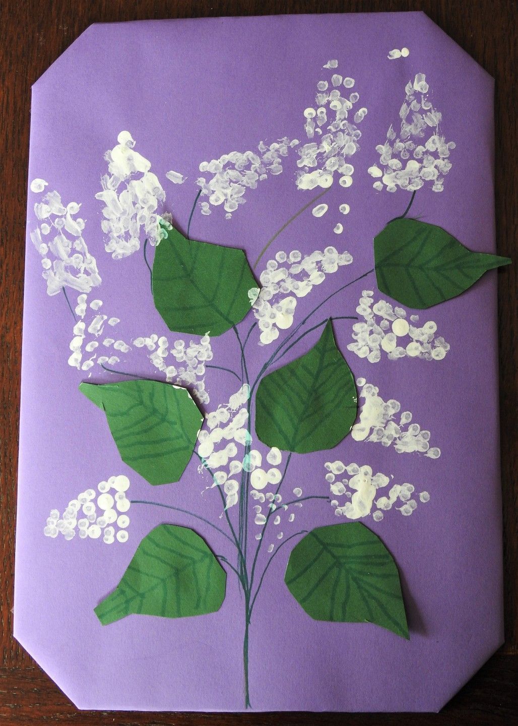 Nathan fait lui aussi un tableau avec des lilas feuilles découpées dans du papier vert dessin des nervures au feutre fleur à la peinture blanche avec un coton tige
