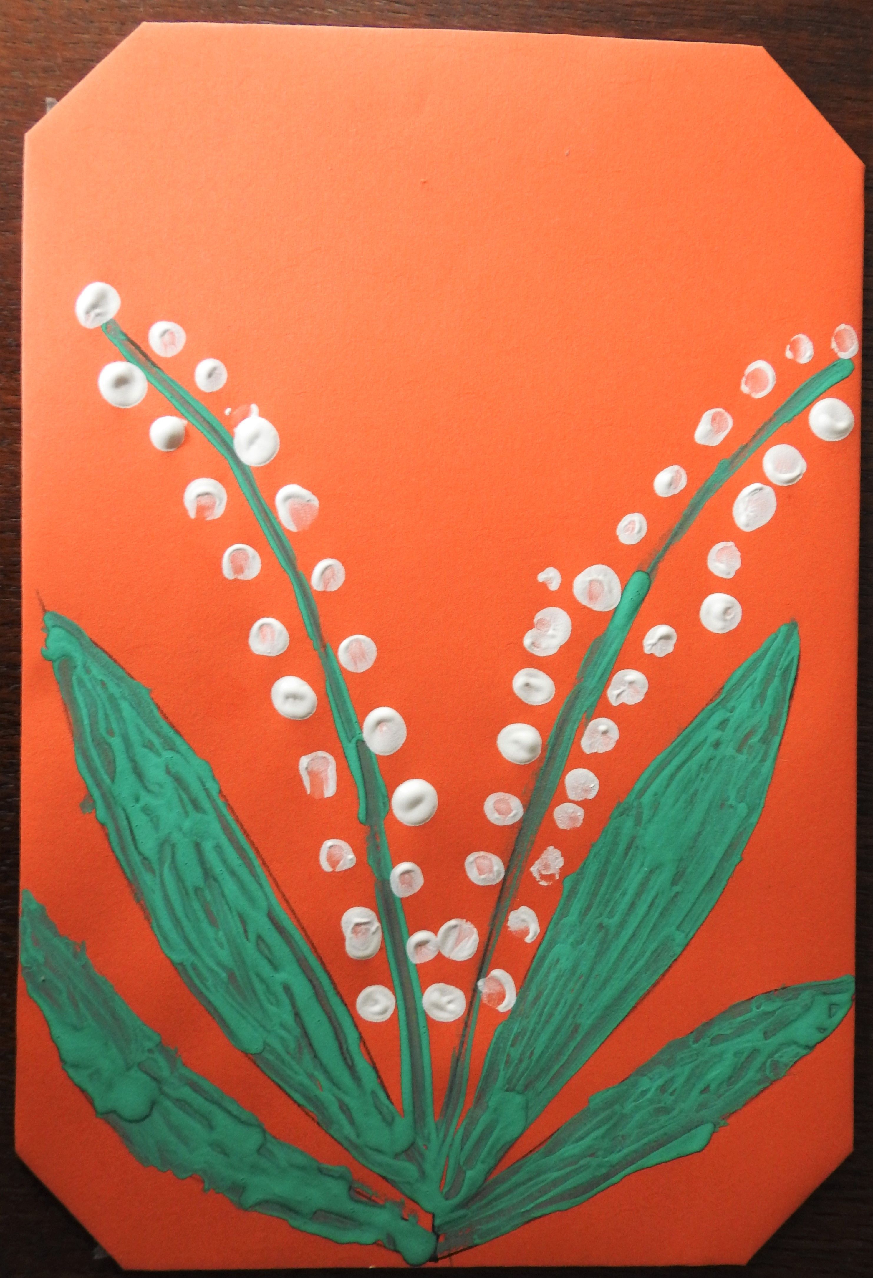 Antonio fait un tableau avec du muguet feuille à la peinture et clochettes du bout de l'index....